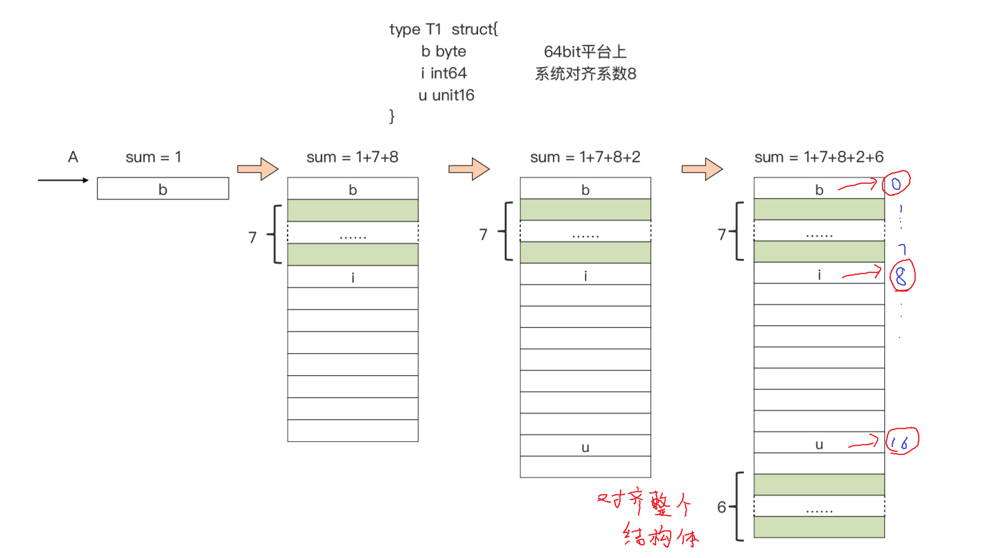 我们看到,结构体 S1 定义中有三个“非常规形式”的标识符,分别是 T1、t2 和 I,这三个标识符究竟代表的是什么呢?是字段名还是字段的类型呢?这里我直接告诉你答案:它们既代表字段的名字,也代表字段的类型。我们分别以这三个标识符为例,说明一下它们的具体含义: